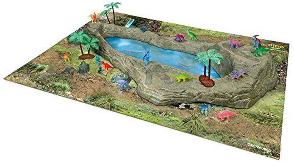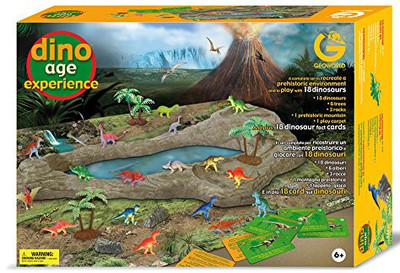 18 coloratissimi dinosauri in una magnifica scenografia preistorica in 3D con montagne, rocce, corsi d’acqua e vegetazione selvaggia