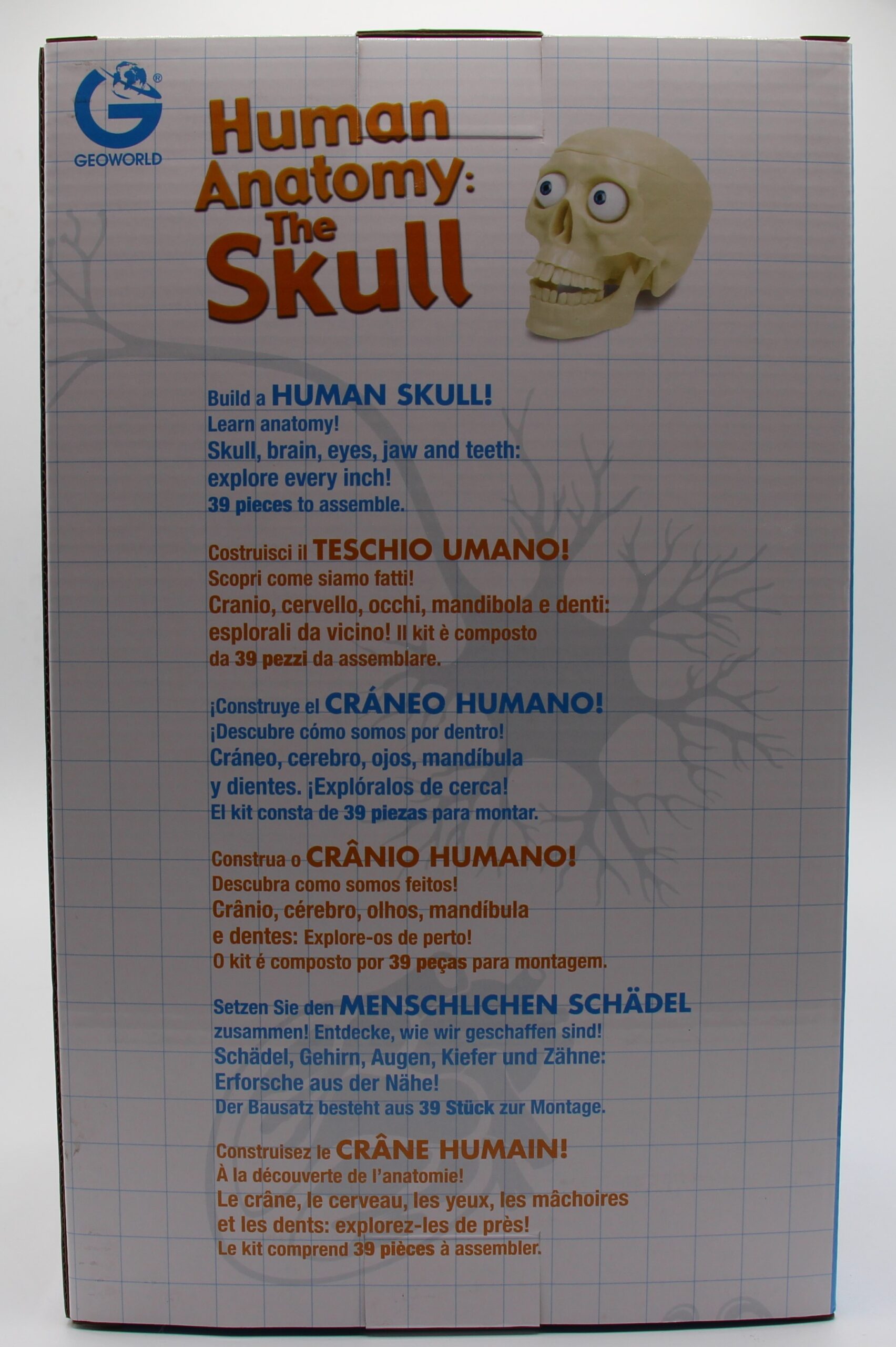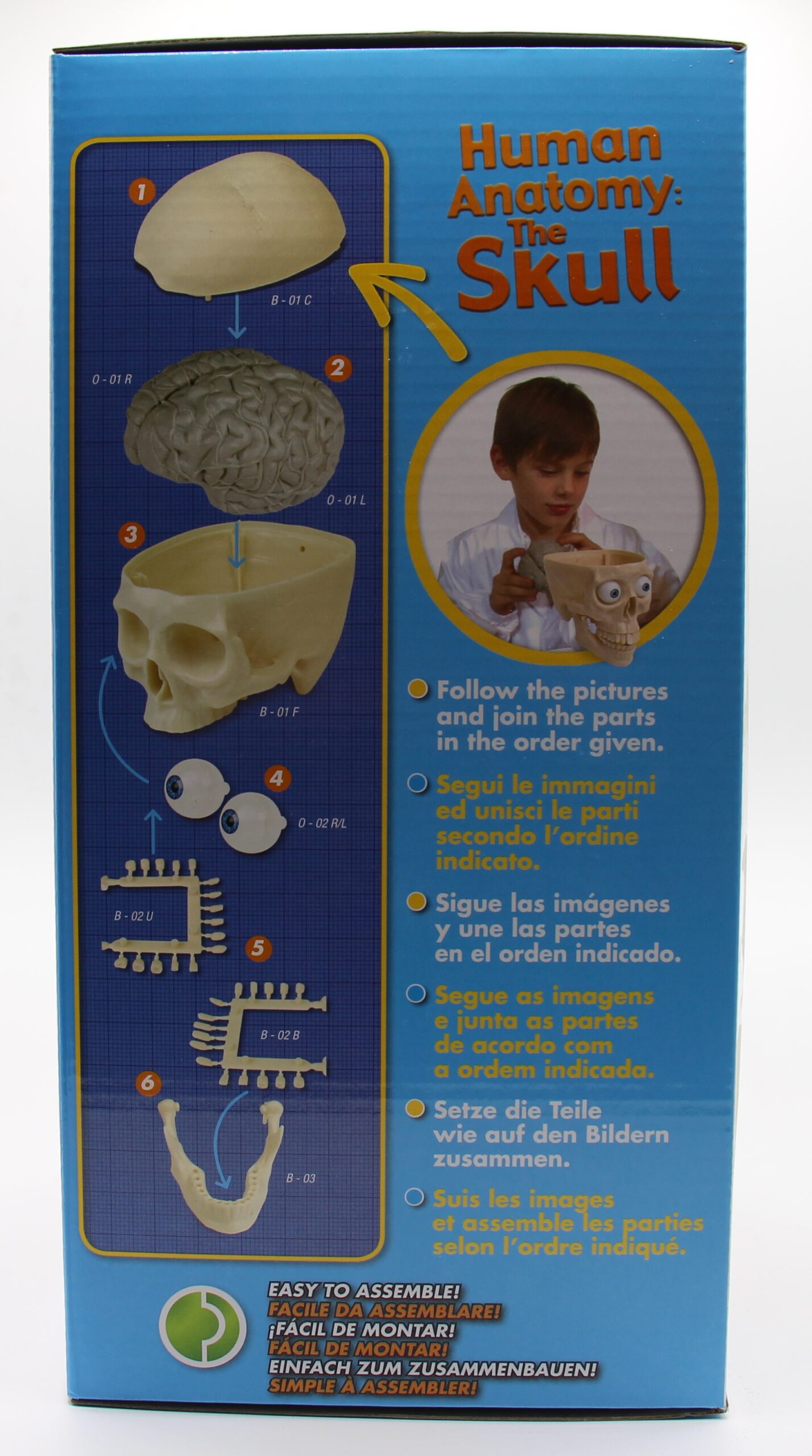 Contenuto della confezione: 39 pezzi per costruire il tuo teschio umano, con cervello diviso in 2 lobi, occhi, mandibola, denti e scatola cranica.