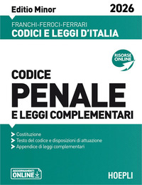 Edizione 2026 del Codice penale e leggi complementari. Editio Minor. Con le più recenti pronunce della Corte Costituzionale e i principali nuovi provvedimenti di cui si è tenuto conto L. 2 dic. 2025, n. 181: Introduzione del delitto di femminicidio e altri interventi normativi per il contrasto alla violenza nei confronti delle donne e per la tutela delle vittime L. 1° dic. 2025, n. 179: Conversione del D.L. 3 ott. 2025, n. 146, recante disposizioni urgenti in materia di ingresso regolare di lavoratori e cittadini stranieri L. 3 ott. 2025, n. 147: Conversione del D.L. 8 ago. 2025, n. 116, recante disposizioni urgenti per il contrasto alle attività illecite in materia di rifiuti L. 23 set. 2025, n. 132: Disposizioni e deleghe al Governo in materia di intelligenza artificiale L. 8 ago. 2025, n. 119: Conversione del D.L. 30 giu. 2025, n. 96, recante disposizioni urgenti per l’organizzazione e lo svolgimento di grandi eventi sportivi L. 9 giu. 2025, n. 80: Conversione del D.L. 11 apr. 2025, n. 48, recante disposizioni urgenti in materia di sicurezza pubblica All’indirizzo web www.hoeplieditore.it/2188-8 sono disponibili eventuali aggiornamenti legislativi.