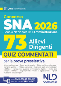 La Scuola Nazionale dell’Amministrazione ha indetto un concorso pubblico, per esami, per l’ammissione di n. 73 allievi al corso – concorso selettivo di formazione dirigenziale per il reclutamento di n. 61 dirigenti nelle amministrazioni statali, anche a ordinamento autonomo, e negli enti pubblici non economici. La procedura concorsuale è articolata in una eventuale prova di preselezione, tre prove scritte ed una orale. Il Volume Concorso SNA. 73 Allievi dirigenti. Quiz commentati, NLD Concorsi, 2026 viene incontro alle specifiche esigenze di chi deve prepararsi ad affrontare tutte le prove concorsuali. Il Volume contiene, infatti, quiz con soluzioni commentati sulle seguenti materie: Diritto costituzionale; Diritto amministrativo; Diritto dell’Unione Europea; Economia politica; Politica economica; Economia delle amministrazioni pubbliche; Management pubblico e innovazione digitale; Analisi delle politiche pubbliche; Ragionamento verbale e logico-astratto; Quesiti situazionali; Lingua inglese. Il Volume tiene conto delle più recenti novità normative, tra cui il D.L. 19 febbraio 2026, n. 19 (c.d. Decreto PNRR) e la L. 07 gennaio 2026, n. 1 (Riforma della Corte dei Conti e della Responsabilità erariale). I quiz, con soluzioni guidate e commentate, sono per lo più suddivisi per ciascuno dei capitoli di cui si compone il corrispondente Manuale Concorso SNA. 73 Allievi dirigenti. Teoria e quiz, NLD Concorsi, 2026 in modo da consentire di affiancare, allo studio teorico, un mirato esercizio pratico. Il Volume permette, infine, l’accesso ad un’estensione online, consultabile con apposita password, per rimanere aggiornati sulle materie oggetto d’esame e per esercitarsi con il simulatore online. Per una completa trattazione delle materie concorsuali si consiglia il Manuale Manuale Concorso SNA. 73 Allievi dirigenti. Teoria e quiz, NLD Concorsi, 2026.