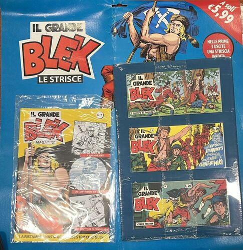 La confezione comprende il fascicolo principale Il Grande Blek Magazine n. 1 e tre albetti/strisce allegati, come visibile in foto. In copertina è presente anche l’indicazione promozionale “Nelle prime 3 uscite una striscia inedita” e il prezzo originale di copertina € 5,90.